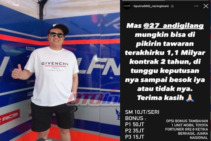 Otoinfo.id – Melanjutkan tawaran H. Putra Rizky pemilik tim LFN HP969 Racing Team pada Andi Gilang, H. Putra kembali menawarkan kontrak dengan menaikkan nilai 1,1M dengan tambahan bonus menang maupun SM atau start money di tiap balapan.n Ini adalah tawaran nilai kontrak terbesar sepanjang sejarah balap motor tanah air. Dari sebelumnya tawaran 1M untuk kontrak dua […]